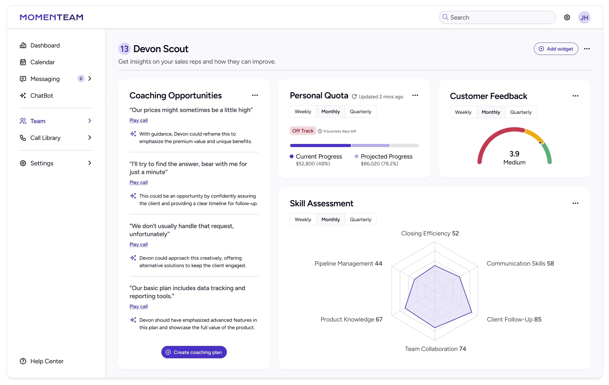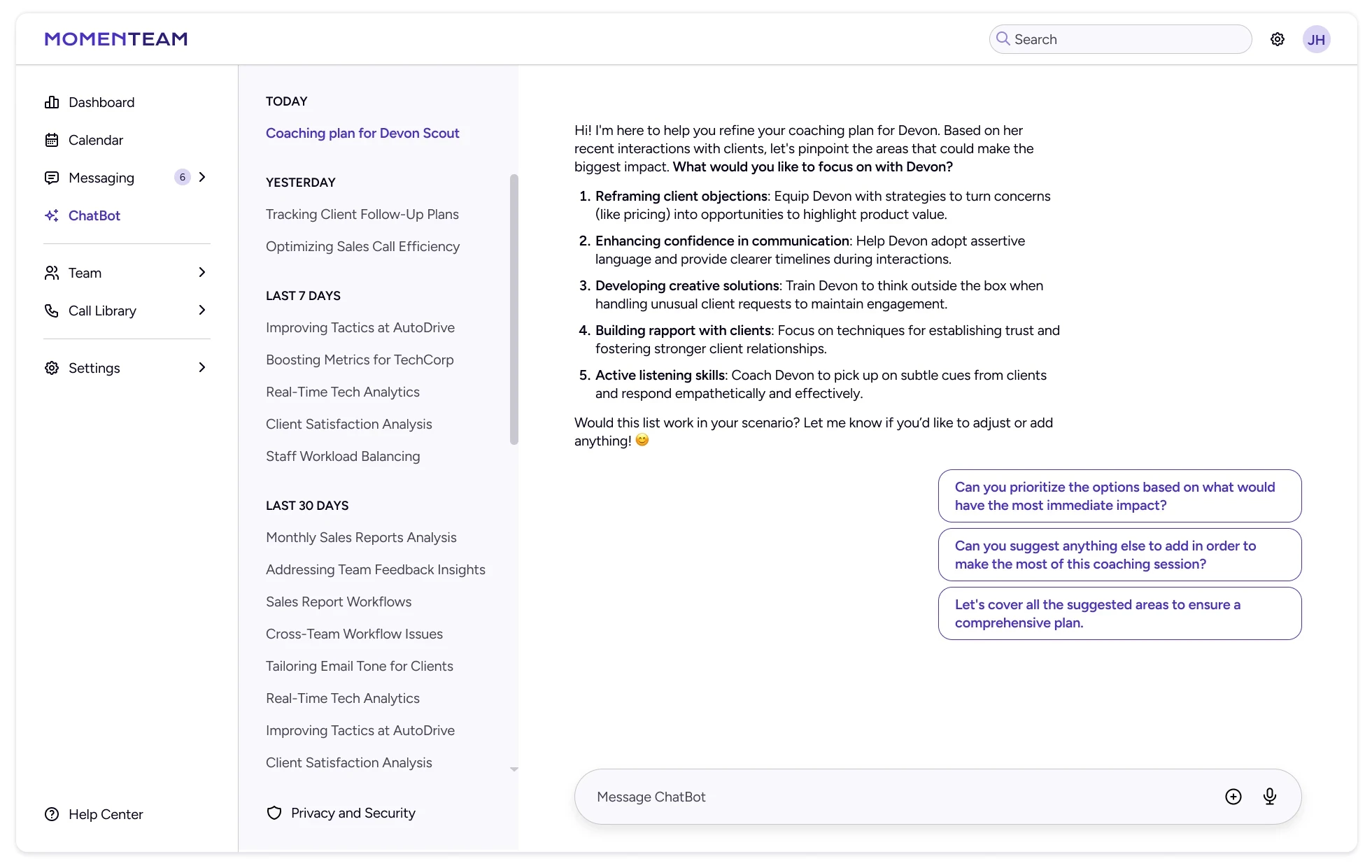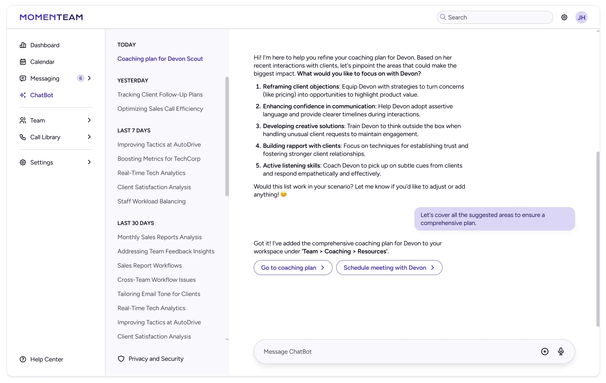To address the needs uncovered during user research, I designed a user flow that demonstrates browsing through sales team data, and leads to the creation of a coaching plan for a sales agent.