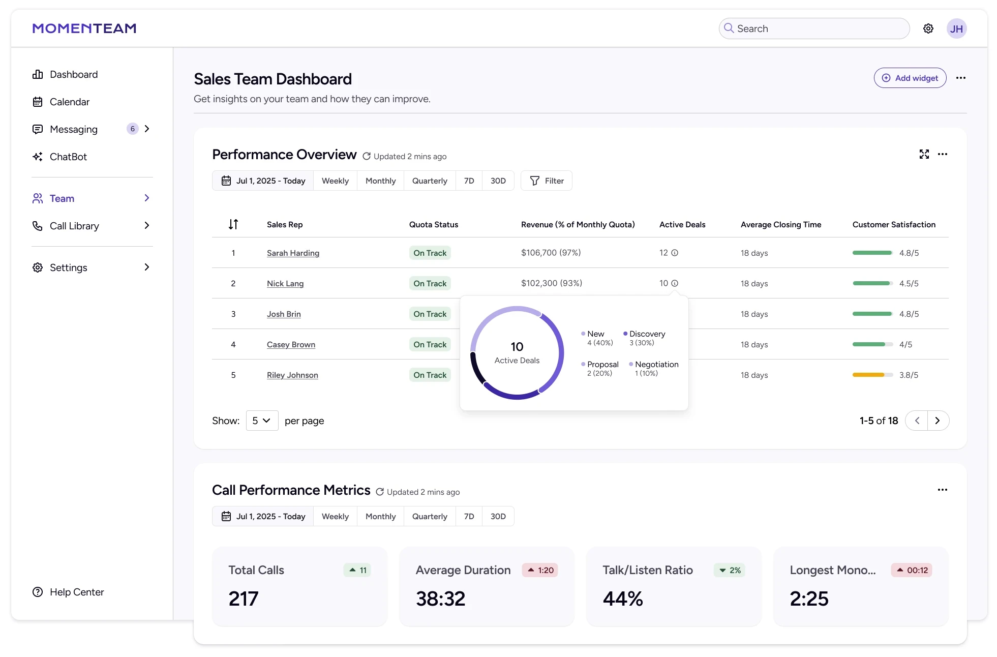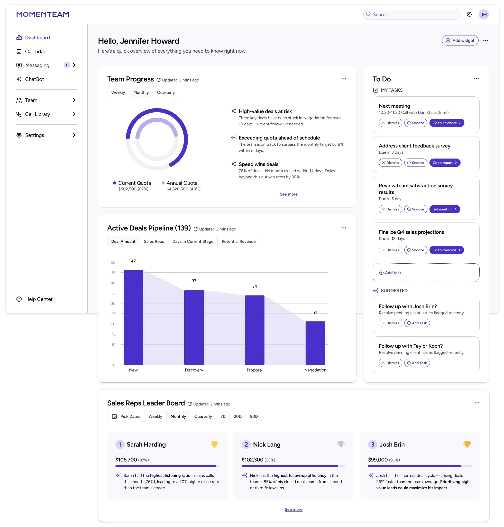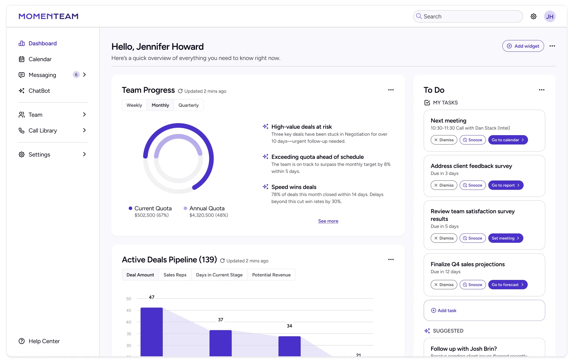 Traditionally, sales analytics include data visualization, predictive analytics, and performance tracking. My objective was to offer these functionalities, and enhance them with AI insights, in a way that isn’t intrusive and doesn’t cause cognitive load.