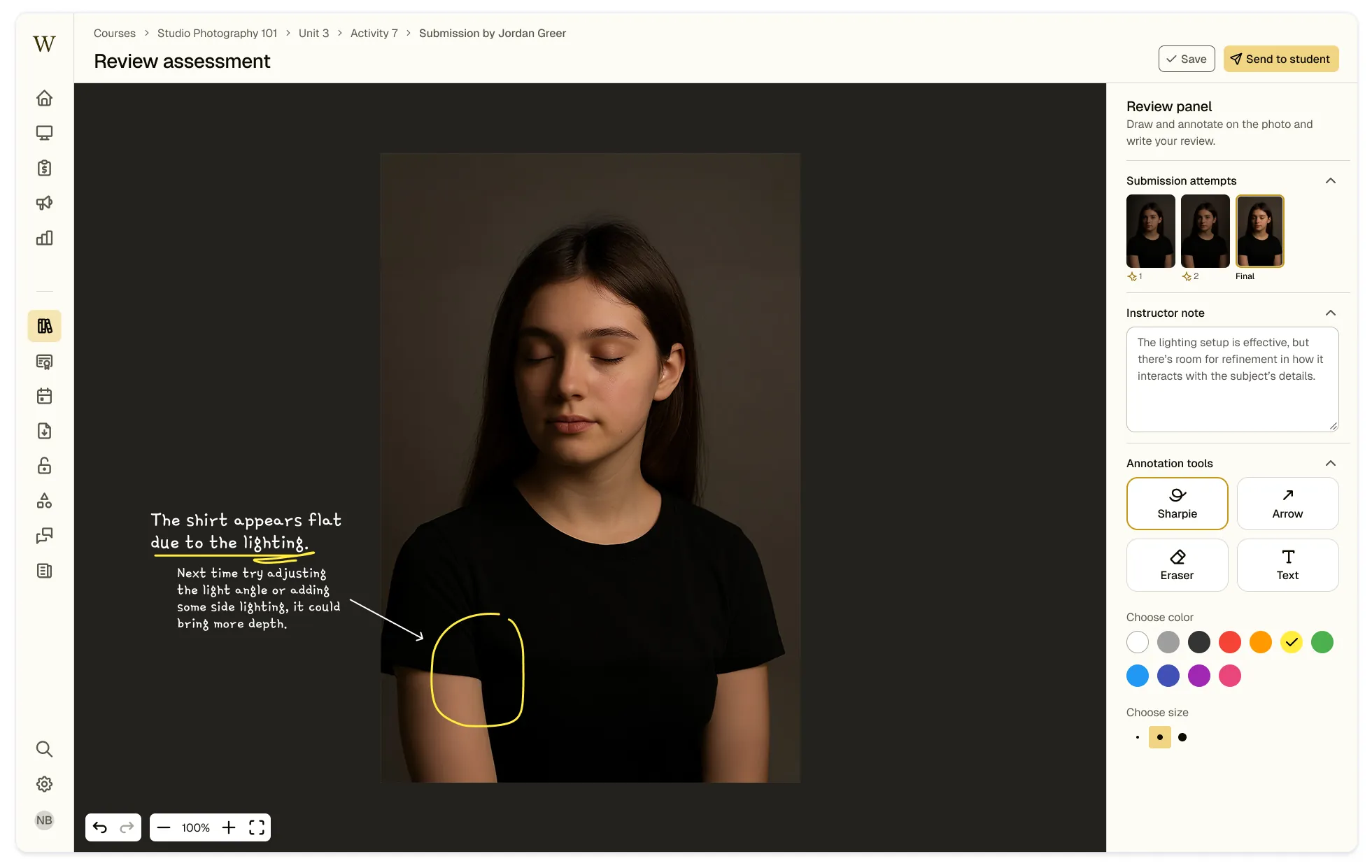 The instructor is left to evaluate the final submission, providing feedback on creative choices using annotation tools for guidance. Key areas can be highlighted to help students improve. Previous attempts remain visible to assess students' learning progress.
